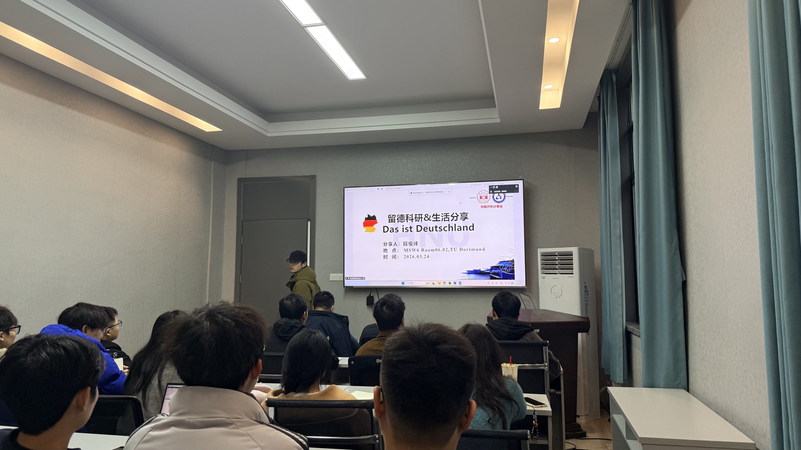 分享环节,段俊峰博士从多维度展开介绍,详细讲述了德国院校的校园环境、实验室组成架构,全面汇报了自身科研近况与近期进展,同时分享了在德生活日常与中德文化差异。他重点提及,德国社会秩序感极强,科研氛围严谨务实,这种严谨态度也深刻影响着科研实践,并热情欢迎师弟师妹前往该校学习、开展联合培养,搭建跨国际学术交流桥梁。